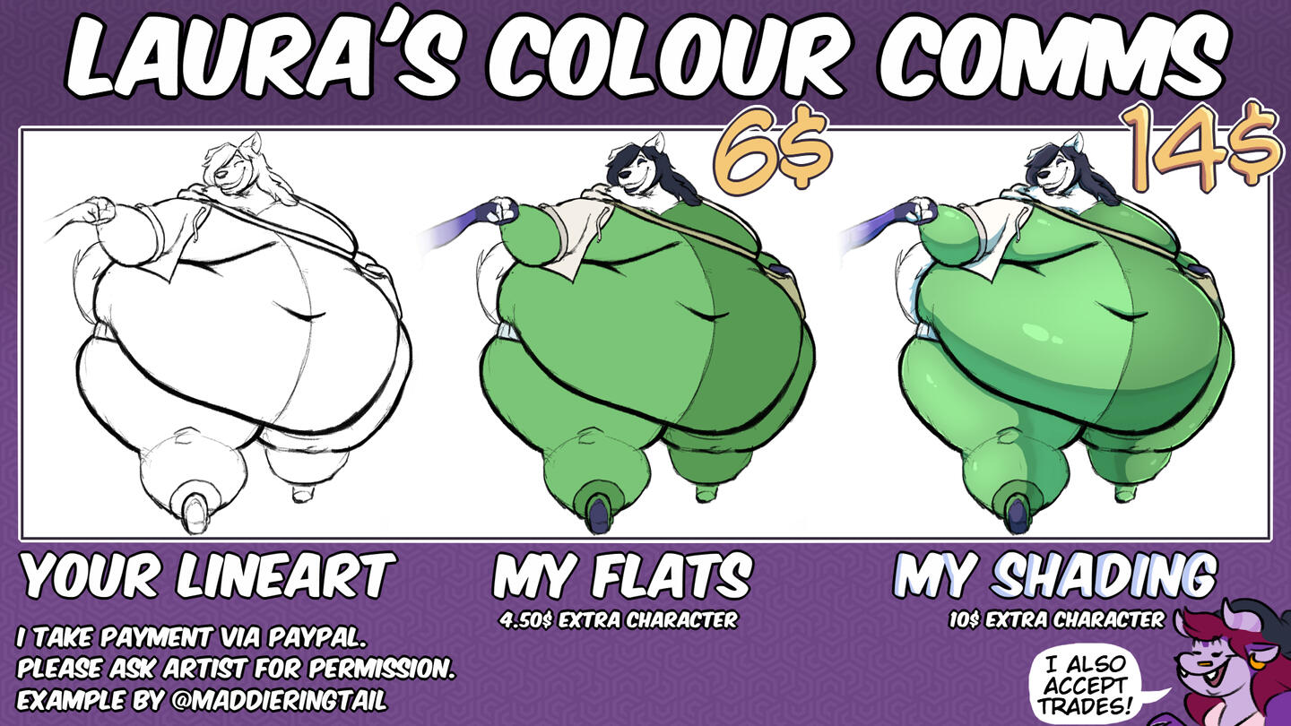 By commissioning me, you consent you have permission from the original artist.I use Paypal, money must be ready before I start the comm.Late payments include additional fees, 5 dollars are added every 4 days.You can post the final pic anywhere the original artist lets you, but you have to credit me when you post it.I may cancel a commission for any reason, if I do I will give a short explanation. If you use derogatory terms while commissioning me I am terminating the transaction.